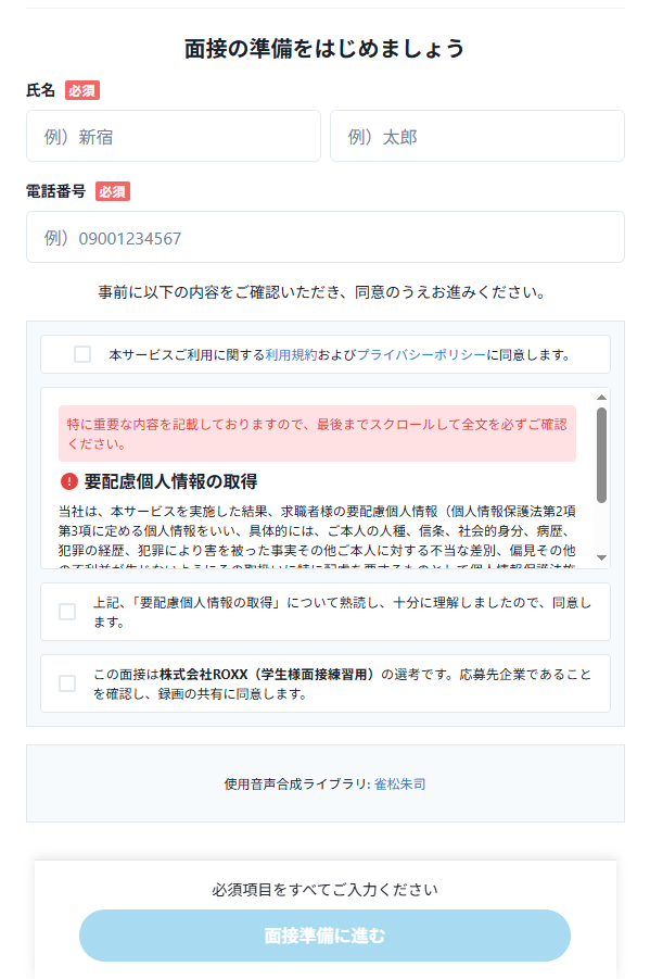 ページ下部のフォームにお名前と電話番号を入力し、「面接準備に進む」を押下してください。