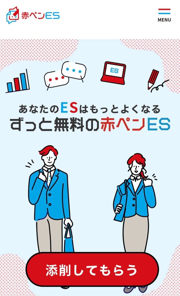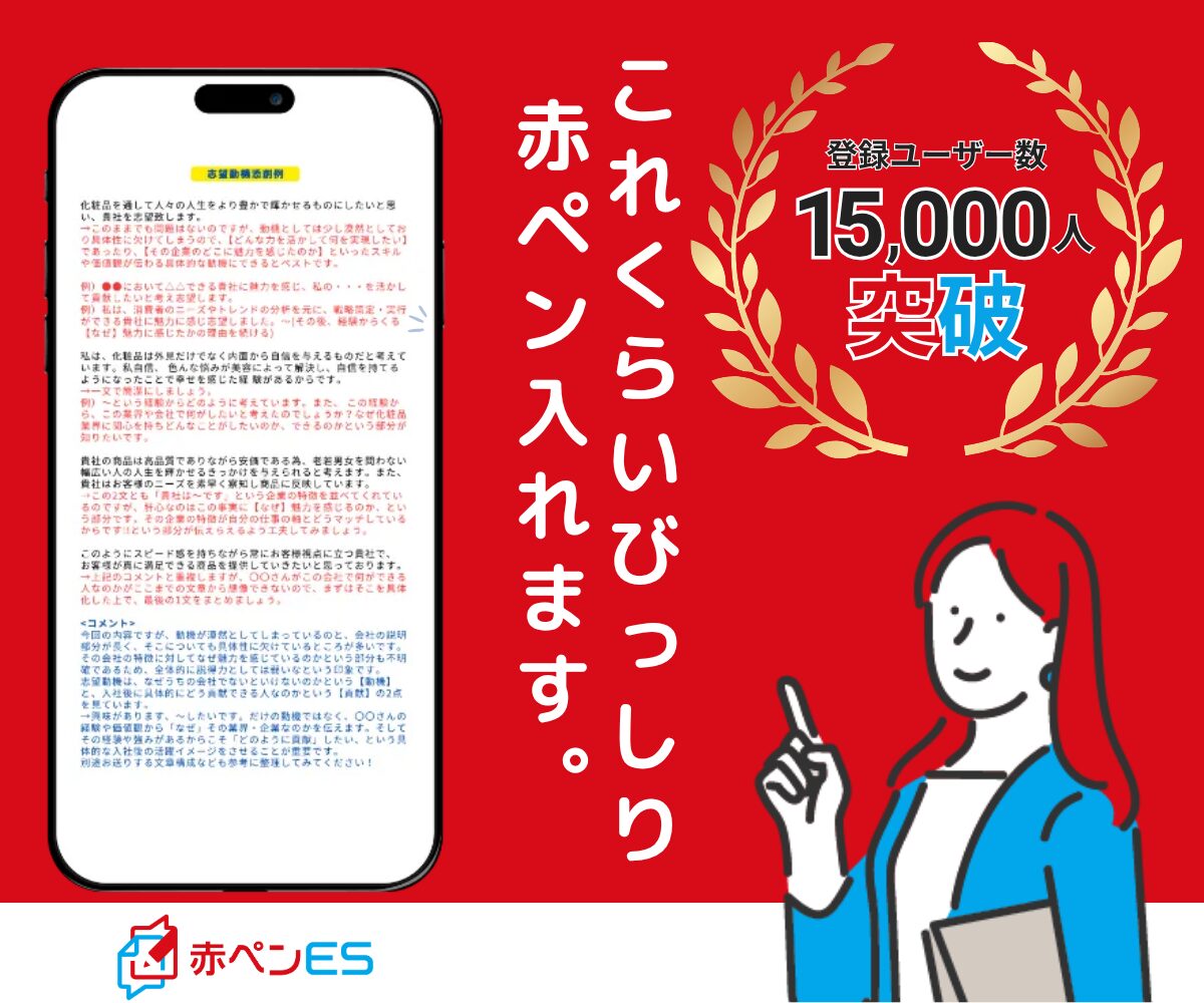 「赤ペンES」は、キャリアアドバイザーがひとりひとり丁寧に赤ペンでしっかり添削してくれる就活生のための無料ES添削サービスです。