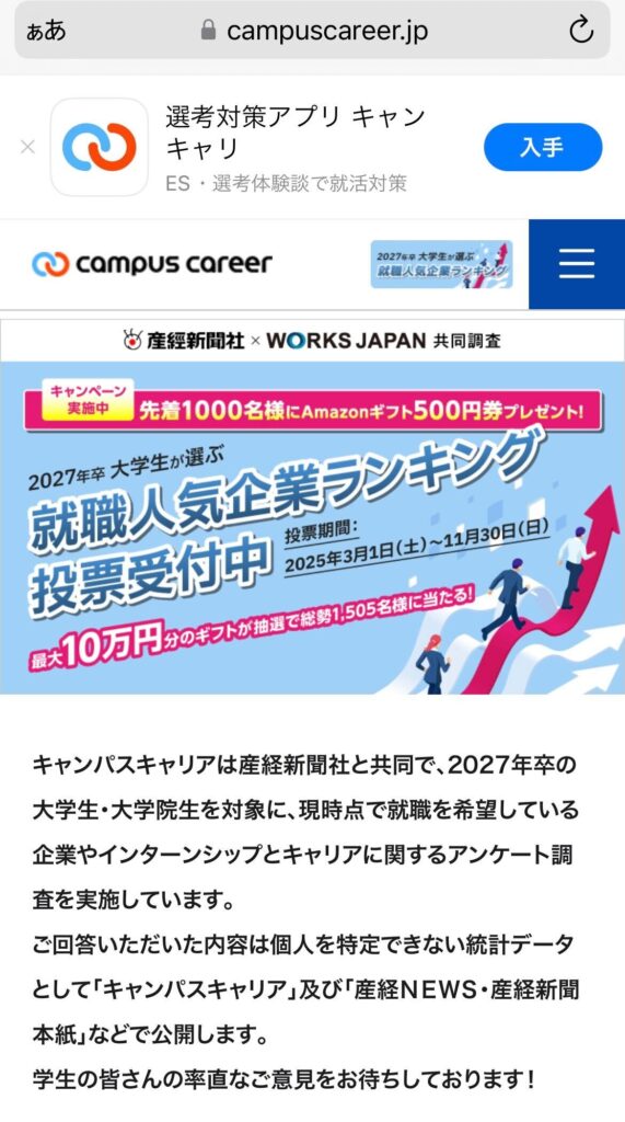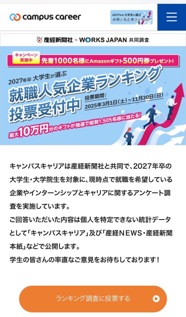 注目企画!「産経新聞×キャンパスキャリア 就職人気企業ランキング調査」に投票しよう。投票は選択式で、たった3分!