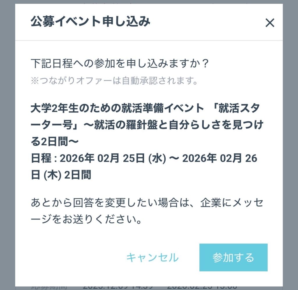 ⑦ログイン後、確認画面が表示されますので「参加する」をタップして応募は完了です!