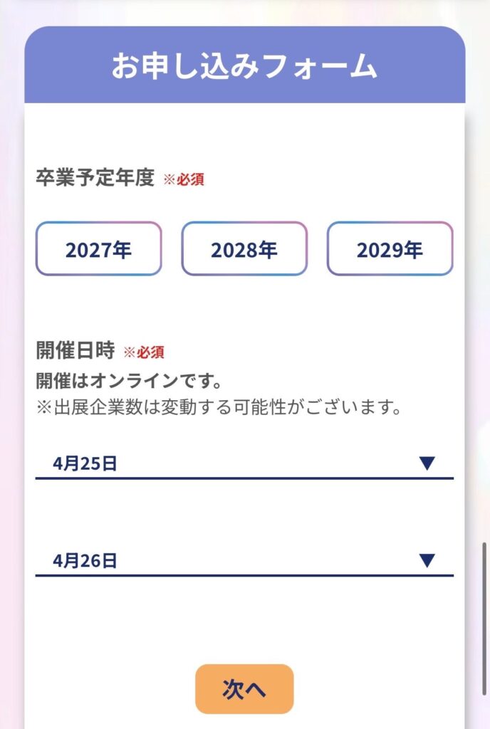 お申し込みフォームに卒業予定年度や氏名など、項目に従ってそれぞれ入力してください。