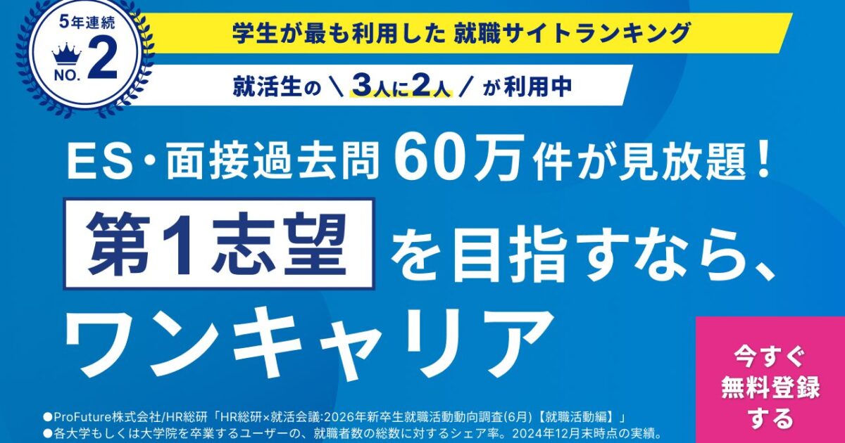 協賛概要 <サービス名> ONE CAREER <サービス概要> 就活生の3人に2人が利用中!企業探しからエントリー、選考対策までひとつで完結する就活サービス『ワンキャリア』 「就活の面接で何を聞かれてどう答えれば良いか … 続きを読む 【27卒/28卒対象】ES・面接過去問60万件が見放題!|ワンキャリア