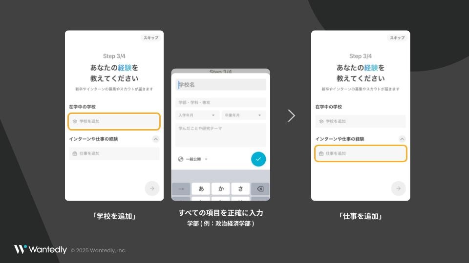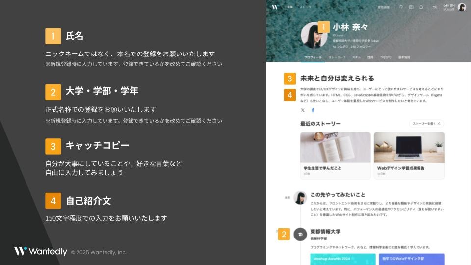 生年月日・自身の興味・学校(正式な学部名)・仕事(インターン経験がある場合)・居住地を入力してください。